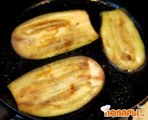 Обжариваем дольки баклажанов в растительном масле с обеих сторон до золотистого цвета и мягкости, выкладываем их на бумажные салфетки для удаления излишков масла.