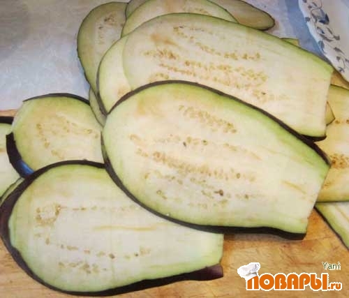 Баклажаны выдерживаем около получаса в подсоленной воде для того, чтобы убрать свойственную им горчинку. Режем баклажаны вдоль на тонкие пластины, солим с двух сторон.