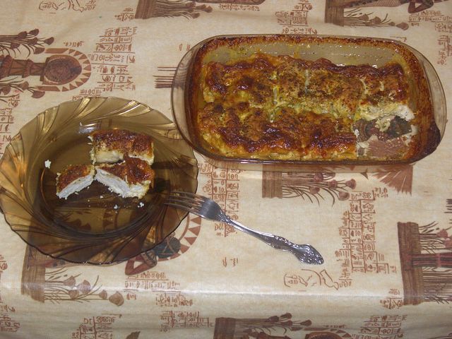 Выкладываем начинку на подготовленную курицу, сворачиваем рулетиком и выкладываем на протвинь. Долить чуть-чуть воды.Ставим в духовку при t 180 градусов на 50 мин.