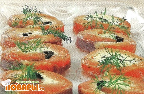 Разложите приготовленную смесь на филе, по краю уложите маслины, сверните рулеты. Заверните рулеты в пергамент и выдержите в холодильнике не менее 3 часов.
