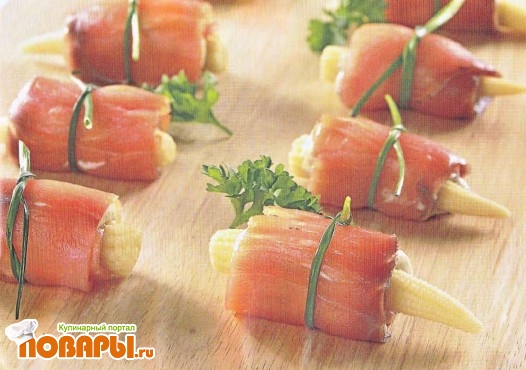Початки кукурузы отварите на пару до готовности. В сыр добавьте рубленый укроп и перец. Перемешайте. Сырной массой смажьте ломтики семги, оберните их вокруг початков кукурузы, перевяжите перьями зеленого лука. Оформите зеленью.