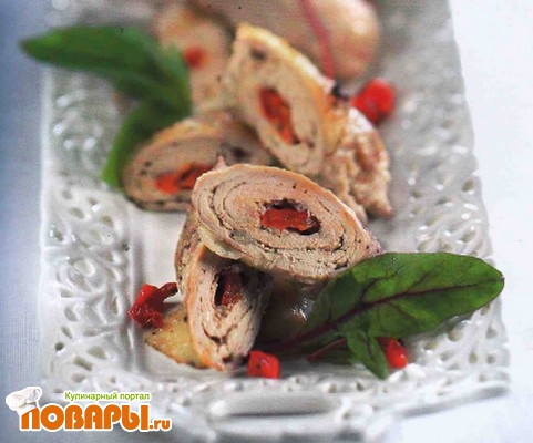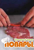 Грубо растолките душистый и черный перец с солью в ступке. Нарежьте отбитую вырезку прямоугольниками среднего размера. В центр каждого прямоугольника положите полоску сладкого перца. Сверните мясо рулетиком.
