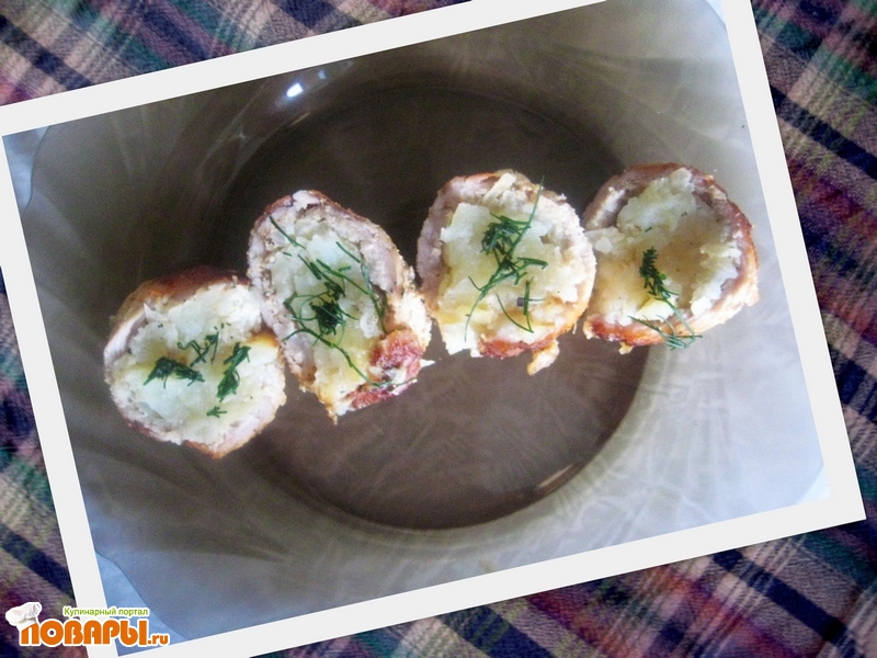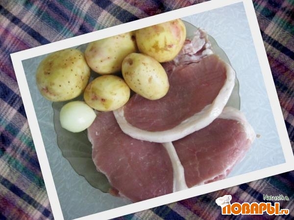 Свинину нужно хорошо отбить, посолить и поперчить с обеих сторон. Картофель отварить и сделать из него пюре (пюре сделать немного водянистым и посолить). Нашинковать лук и тонким слоем выложить на отбитую свинину,