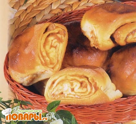 Смазать противень маргарином и уложить рулетики. Выпекать в горячей духовке при температуре 180° С до румяной корочки.