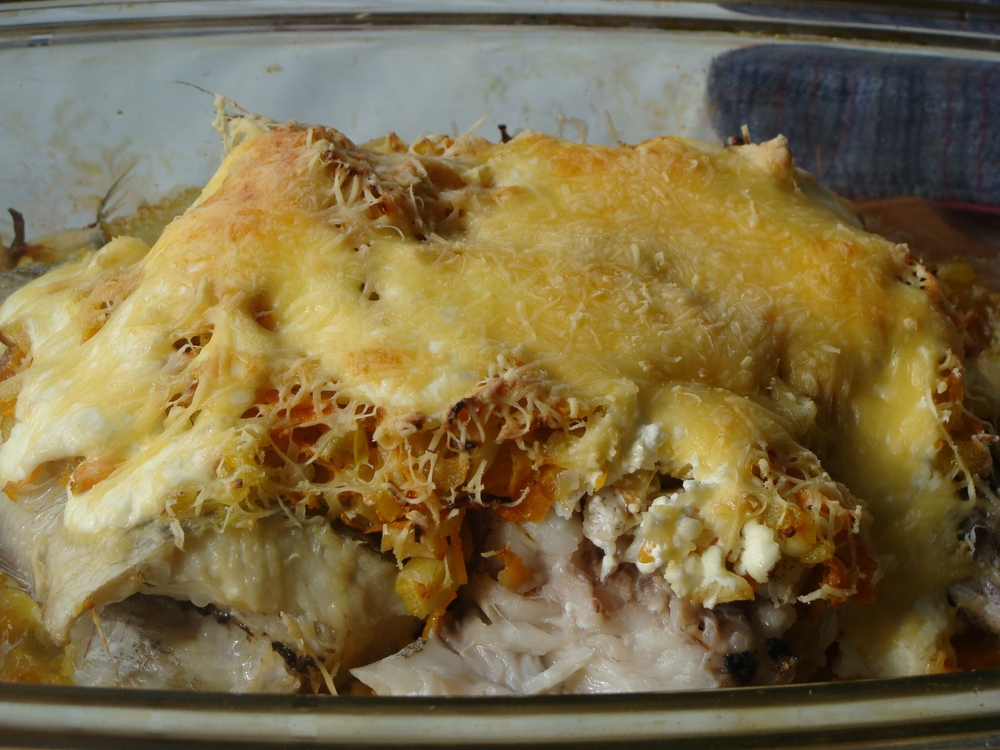 Сверху выложить морковь с луком и чесноком и все залить сметаной. Сыр натереть на крупной треке и присыпать рыбу. Запекать при температуре 180 градусов примерно 25-30 минут.