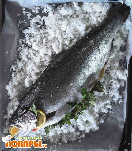 Положите форель на бок на сделанную соляную «подушку», засыпьте оставшейся солью, утрамбовывая ее так, чтобы получилась плотная горка. Если соль разваливается, можете добавлять понемногу воду из ладоней -но не больше 2/3 стакана.