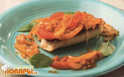 Овощи посолите, поперчите, добавьте паприку, семена кумина, влейте полстакана воды. Тушите овощи до полуготовности, затем выложите на рыбу и запекайте ее 30 минут при 170-180 °С.