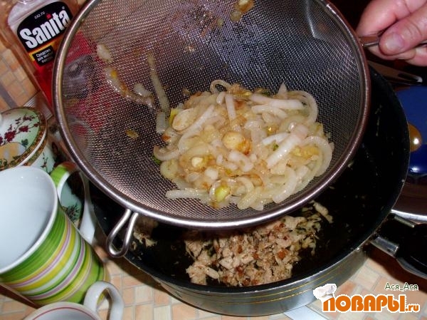 А вот небольшой трюк. Перед тем как украсить луком рыбу, избавьтесь от избытка масла на луке. Для этого выложите лук в сито и встряхните несколько раз.