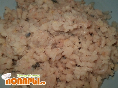 пол килограмма риса, два яйца, два больших лука, перец, соль. Рыбу и лук перемолоть через мясорубку,