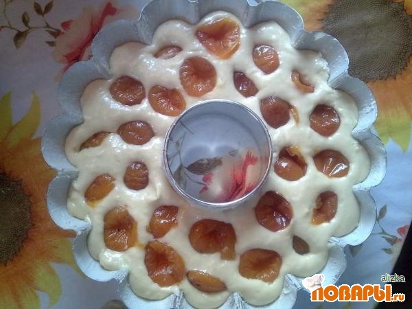 Влить в форму тесто. Разровнять. Сверху разложить абрикосинки вдавливая их в тесто.