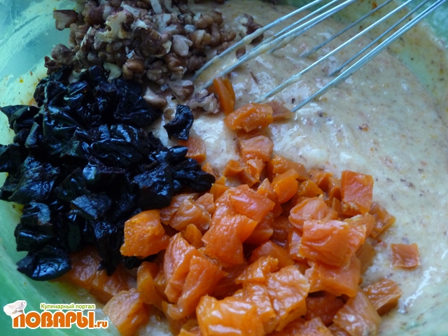 Мучную смесь добавляем в пюре, перемешиваем хорошо до исчезновения комочков. Добавляем в тесто курагу, чернослив и орехи, перемешиваем, чтобы они равномерно распределились.