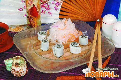 Филе кальмара нарезать тонкими узкими полосками. Листья нори обдать кипятком, растереть с небольшим количеством васаби и соевого соуса. Приготовленной пастой смазать полоски кальмара и свернуть их в виде рулета. Дайкон и морковь вымыть, очистить, тонко нарезать, посолить. Кальмары и овощи выложить на тарелку, отдельно подать соевый соус.