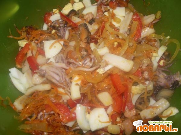 Морковь режем соломкой, лук полукольцами - обжариваем на растительном масле. Морской коктейль кидаем в кипящую воду на 5 минуток. Вытаскиваем - добавляем в обжареным овощам, режем перчик и яицо соломкой. Перемешиваем, добавляем майонез.