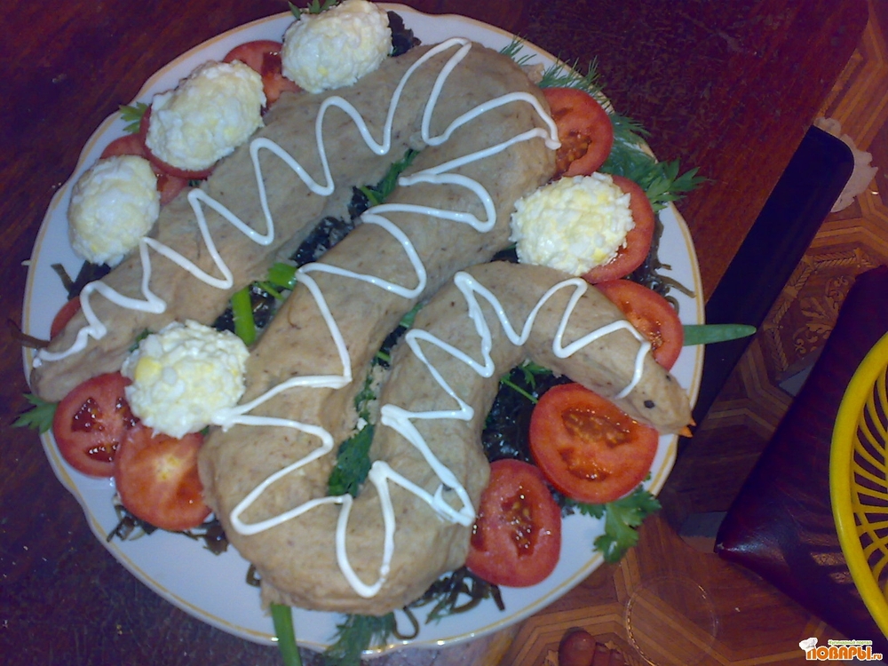 Змейка: Сардины и 2 желтка размять вилкой, добавить тертый картофель и 2 плавленых тертых сырка. Добавить 50 грамм масла, немного майонеза, чеснок, посолить и поперчить. Все хорошо перемешать до однородной массы.