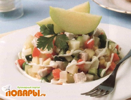 Мякоть курицы, яблоко, овощи и яйца нарежьте мелкими кубиками, соедините, посолите, добавьте зеленый горошек, майонез, перемешайте. Выложите в салатник. При подаче оформите салат зеленью.