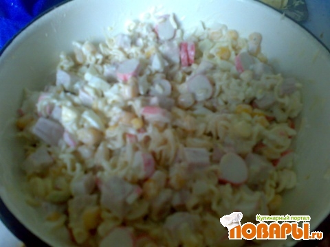 Все ингредиенты мелко режем, заправляем майонезом и перемешиваем. Салат очень вкусный!