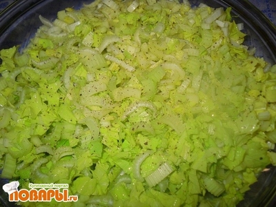 Далее поверх огурца выкладываем не крупно нарезаный стебель сельдерея. Немного приправьте черным молотым перцем.