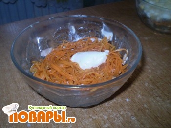 Сверху положить шар моркови по- корейски, и чем острее она будет, тем лучше, и опять перемазать майонезом,