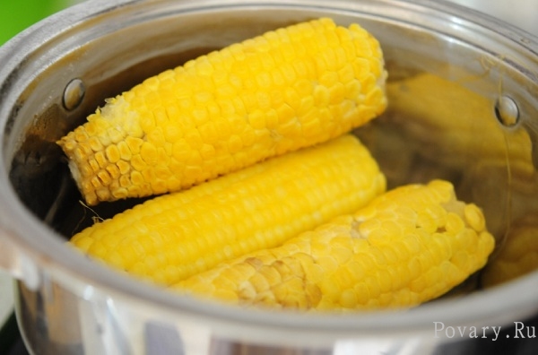 Кукуруза у меня свежая, молочная, варится минут 20. Но можно взять консервированную кукурузу. Кукурузку я счистила под углом.