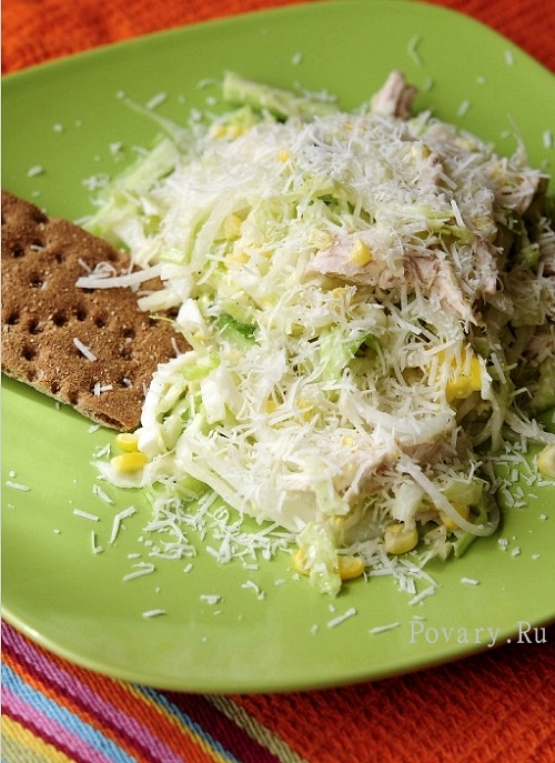 Салат у нас диетический, поэтому мы будем заправлять его маслом подсолнечным, кукурузным или еще вкуснее маслом из грецкого ореха. Скажу вам по секрету с майонезам такой салат вкуснее, но майонез содержит много калорий. Именно поэтому я добавляю в салат немного тертого сыра, например пармезана или овечьего. Ну и конечно не забудьте черный перец по вкусу.