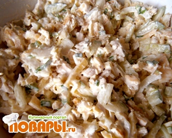 Смешиваем все ингредиенты, добавляем майонез, солим и перчим по вкусу.