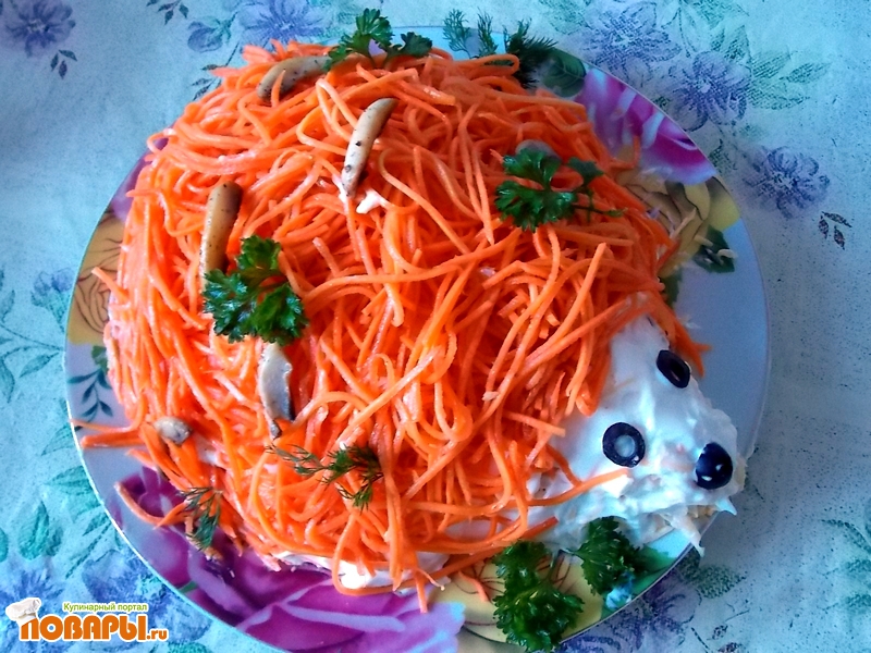 Носик и глазки - маслины. Иголки - корейская морковь, мордочку посыпать сыром.