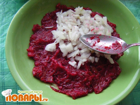 Выкладываем на тарелку треть овощной массы, сверху слой маринованного лука, и затем оставшуюся массу.