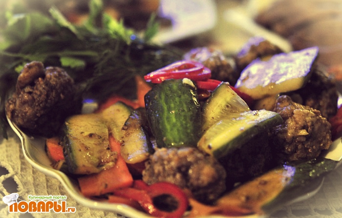 В отдельной посуде смешайте сладкий красный перец, порезанный тонкими кружками, так же огурец порезанный пластинами. Залейте все соевым соусом, уксусом, чеснок помельчите, красный перец и добавьте специи по желанию. Как только морковь обжарится до 75% готовности, все перемешайте с огурцами и перцем и масло от моркови тоже не забудьте.
