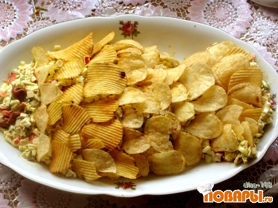 Все смазываем майонезом, выкладываем в салатницу и придаем салатиу форму рыбы. Украшаем чипсами. "Глаз" для "рыбки" делаем из кусочка маслины.