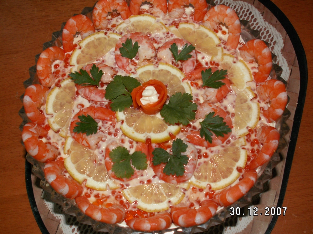 Креветки отварить в специях (лавровый лист, чёрный перец горошком, соль). Картофель и яйца отварить, почистить, натереть на средней тёрке.