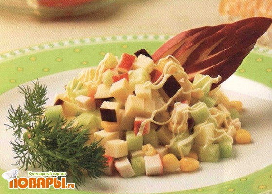 Салат можно выложить слоями, смазывая каждый слой майонезом: кукуруза, сыр, майонез, огурец, крабовые палочки, затем еще раз в том же порядке, но вместо огурца - яблоко.