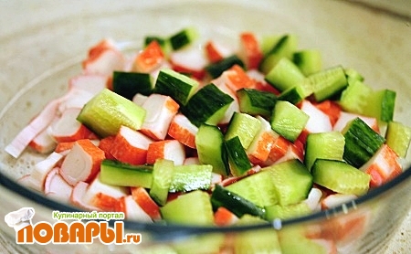 Крабовые палочки, огурцы и порезанные кубики и лимон соединим в отдельной чашки.