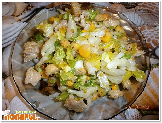 Пекинскую капусту нарезать. Филе порезать кубиками, обжарить с солью и специями. Капусту, курицу, сухарики, кукурузу перемешиваем с горчицей и маслом или майонезом. Салат готов!