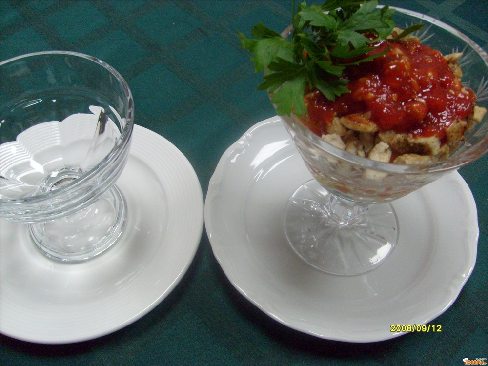 Последний штрих: при подаче компоненты укладывают слоями в хрустальную или стеклянную креманку (филе птицы - сверху), поливают соусом, украшают зеленью (допускается заложить в салат филе птицы в горячем состоянии или использвать салат в перемешанном состоянии).