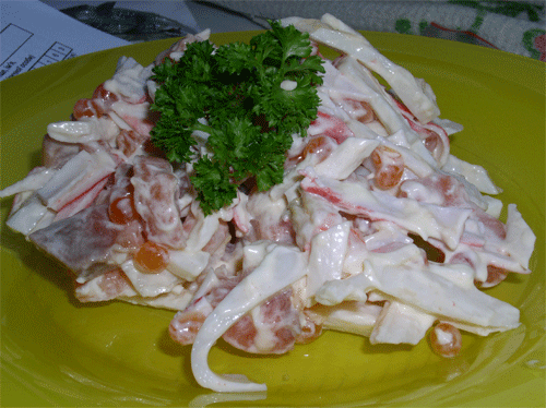 Кальмары отварить. Все ингредиенты нарезать соломкой, перемешать, заправить майонезом, добавить икру, еще раз перемешать и подавать на стол