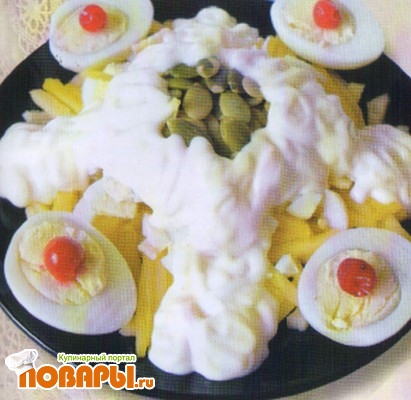 Яйца отварить, охладить, почистить, мелко нарезать и выложить на манго. Посолить, полить майонезом, посыпать очищенными тыквенными семечками, украсить ломтиками отварных яиц и ягодами клюквы.
