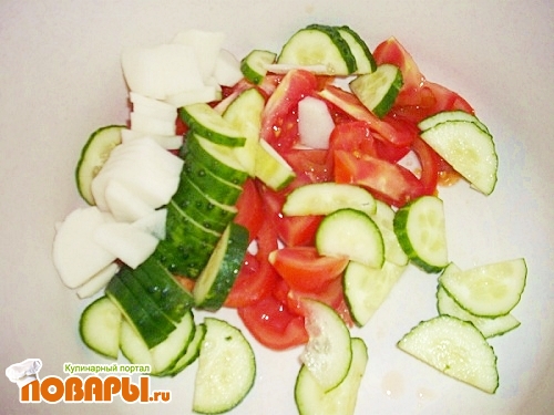 Режем тоненькими пластинками огурец, дайкон. Если у вас есть терка для нарезки, лучше воспользоваться ею. Помидоры так же режем ровными дольками, лучше брать твердые плоды.
