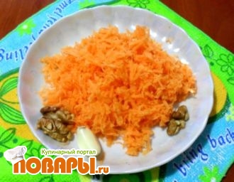 Затем соединяем все составные – сыр, морковь, рубленные грецкие орехи и соус. Красиво выкладываем на тарелку и делаем украшение из свежих овощей или зелени.