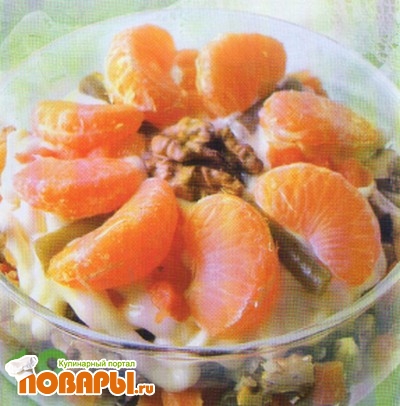 На неё выложить мелко нарезанную отварную морковь, рубленые грецкие орехи, нарезанную мякоть апельсинов. Полить майонезом, украсить.