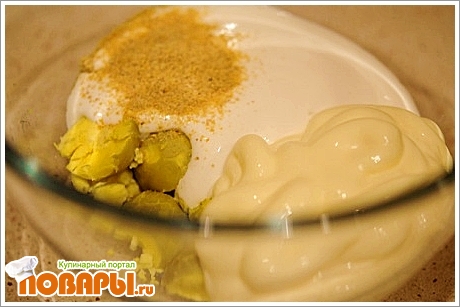 Смешаем ингредиенты: желтки от яиц, майонез, сметана, горчица, оливковое масло, соль и черные перец по желанию. Хорошо перемешать, яйца должны быть покрошенными.