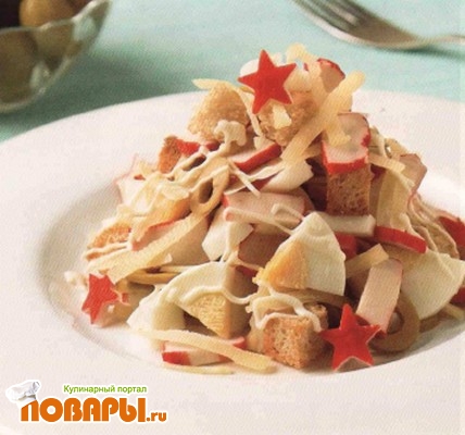 При подаче оформите салат крабовыми полочками, нарезанными в виде звездочек.
