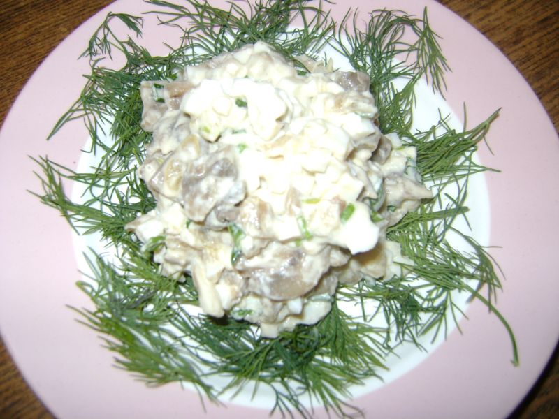 Грибы обжарить с луком, дать остыть. Добавить к ним вареное яичко, зеленый лучок, майонез, перемешать. Все! Салат готов.