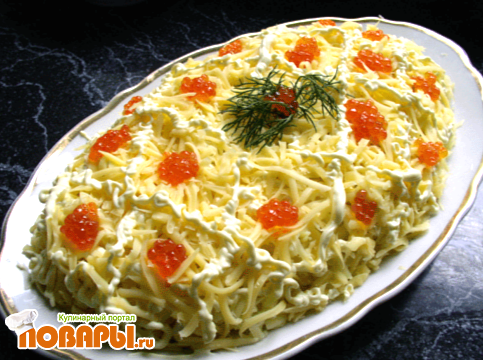 Яйца отварить, белки отделить от желтков, нам понадобятся только белки. Натереть на терке.