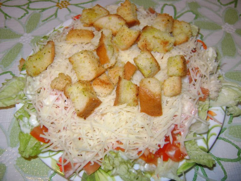 На курочку выложить помидоры порезанные небольшими кубиками, опять майонез. Посыпать натертым на мелкой терке пармезаном, сверху украсить сухариками.