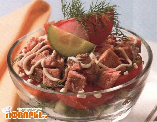 Жареную рыбу и огурцы нарежьте кубиками, зеленый салат - полосками, редис и помидоры - дольками. В салатник уложите подготовленные ингредиенты слоями, полейте каждый майонезом и посыпьте мелко нарезанной зеленью укропа.