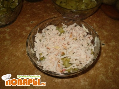 Салат делается шарами, каждый шар перемазывается майонезом. Сначала режим маленькими кусочками крабовые палочки, кладем шар жаренных грибов, потом режим огурцы