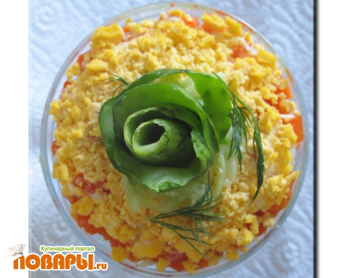 Поверх морковного слоя кладем тертый сыр (пусть слой останется пушистым, не приминайте его!). И снова капелька майонеза. Последним слоем я сделала тертые на мелкой терке яичные желтки. Как и любой слоеный салат, хорошо бы его немного настоять перед подачей к столу.