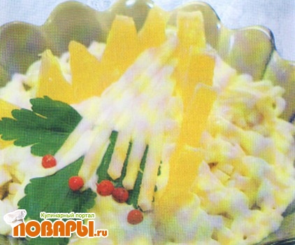 Сельдерей почистить, измельчить и выложить. Полить майонезом, украсить ломтиками апельсина, сельдерея, зеленью петрушки, перцем «розе».