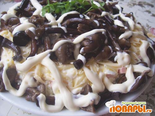 Салатик взяла с сайта povarenok.ru от best. Слова автора. Вместо ветчины добавила вареную колбаску, ну и стакан в середину салата не вставляла. Салатик получился отличный, очень вкусный. Гости салат просто "смели" с тарелочки. Сын проснулся утречком и затребовал опять такой салатик. Пришлось повторить.