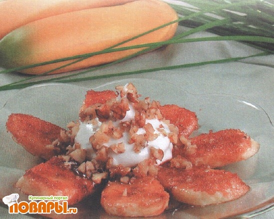 Бананы укладывают на десертное блюдо и оформляют взбитыми сливками.